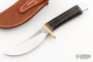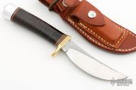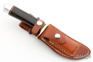 This Model 20 from Randall features a satin finished upswept carbon steel blade with notched thumbrest, .212" blade stock and 1.081" blade depth, hidden tang construction. The handle has a brass guard, stacked leather handle with red/white/blue spacers and a duralumin butt cap. Comes with butterfly stitched Johnson Roughback brown leather sheath. Has a few light scratches, otherwise excellent condition.