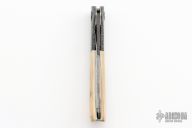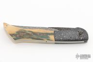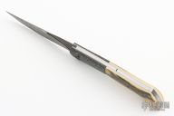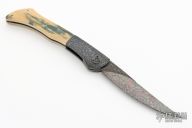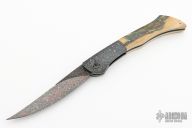 This Makiti Folder by Bertie Rietveld features a carved and colored Dragonskin Damascus blade. The handle has Nebula Damascus bolsters, bark mammoth ivory scales, titanium liners and a stainless steel backspacer. The bolsters have a tilt mechanism used to close the knife call the "Bertie Lock". Pushing both bolsters where they meet the scales towards the spine will release the lock. Nicely matched ivory scales. Beautiful materials. Excellent work. Includes certificate of authenticity dated June 2023. New from maker at the 2023 Blade Show. Bertie's logo is located in the "Stanhope" pivot. Look through it and you will see his logo. Comes with a zippered case.