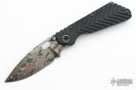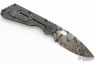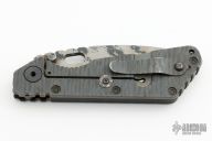 This SMF by Strider Knives features a digicam blade and a handle with grooved aluminum on one side and flame titanium on the other. Titanium clip. Notches on thumb-rest, rear of handle, and lockup. Includes Hinderer "Lock Bar Stabilizer" for maximum reverse lock retention.  Blade shows light signs of use.  Light scratches are visible otherwise the knife is in good condition.