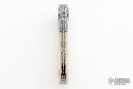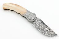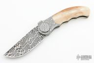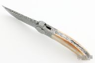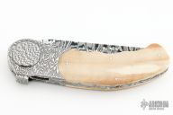 This "Ancient Fighter" Rockback Blade Lock by David Longworth features a Crushed W's Damascus blade (1084 and 15N20), 18k gold Dellena Dots. The handle has Crushed W's Damascus bolsters, Crushed W's Damascus pivot, fossil walrus ivory scales with 18k gold pins, fileworked titanium liners, Crushed W's Damascus backspacer. Push the button on the spine and pull the blade open. To close, push the button and close the knife. This knife is very sturdy and feels rock solid. Comes with a zippered case and COA from the maker. New from maker at the 2023 Blade Show.