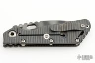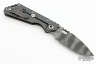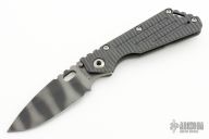 This Mick Strider Performance Series SMF framelock folder features a Tiger Stripe finished spear point blade with thumbhole and notched thumbrest. The handle has a flamed titanium frame with titanium clip, tip up carry. Jimping on blade spine. Includes Hinderer "Lock Bar Stabilizer" for maximum reverse lock retention. Nice detent, lockup and blade seating. Has a scuff on the clip otherwise excellent condition.