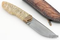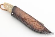This Mr. Musk Ox by Anders Hogstrom features a drop point 1050 blade with beautiful hamon, .240" blade stock and 1.267" blade depth, hidden tang construction. The handle has a textured bronze guard, beautiful musk ox grip with a single pin. Comes with a hand tooled leather sheath and a velcro case. Excellent condition.