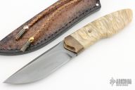 "I make mostly daggers, fighters and what I call “Kwaikens” but also swords and folding knives. I primarily use 1050 carbon spring steel and damascus of various compositions and on occasion, stainless steel for the blades. For the 1050 I employ a clay “tempering” technique that gives the blade a beautiful temper line (hamon) as well as a hard edge while maintaining a flexible core of the blade. These blades are rough ground and then finished off by hand with files and sandpaper before the final stage of etching the blade to bring out the hamon. When it comes to damascus, I tend to lean towards a simpler random or a twist pattern that goes with the overall simplistic scheme of my knives. These blades are worked and finished in a similar fashion as the carbon steel ones. I use stainless steel, mostly Damasteel stainless damascus, for folders, art knives ( for ex. Skull Cleaver and Druid Sickle) and some full-tang dress-knives, my Tuxer model, or upscale hunting/skinning-knives. For the handles and wooden sheaths I use rare exotic hardwoods, ancient ivories and bone material from all over the world. Even large pieces of natural amber has found its way onto a couple of my knives. A few wood favorites are Snakewood for its amazing striped grain pattern, Masur birch, Eucalyptus , and Redwood burl for its sometimes silky appearance."
