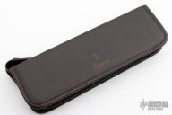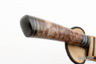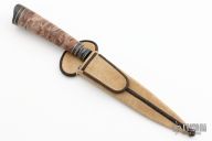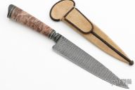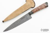 This knife by Mauricio C Daletzky features a Damascus blade with false top edge and an integral fluted guard, .182" blade stock and 1.337" blade depth, hidden tang construction with a mosaic Damascus butt, stabilized maple burl grip with nickel silver and carbon fiber spacers. Comes with a brown leather sheath, leather zippered case. New from maker at the 2023 Blade Show!