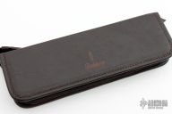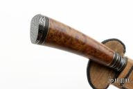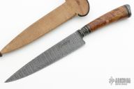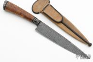 This knife by Mauricio C Daletzky features a Damascus blade with false top edge and an integral fluted guard, .173" blade stock and 1.199" blade depth, hidden tang construction with a mosaic Damascus butt, stabilized maple burl grip with nickel silver and carbon fiber spacers. Comes with a brown leather sheath, leather zippered case. New from maker at the 2023 Blade Show!