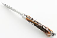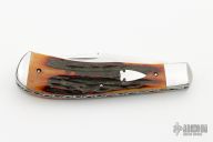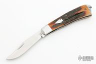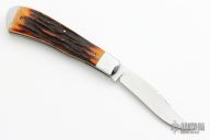 This Trapper by Tobin Hill features a hand rub satin finished clip point blade with a nail nick and polished spine.  The handle features stainless steel bolsters, stag covers with a stainless steel escutcheon, stainless steel liners with fileworked spines, and a fileworked spring. Has half-stop, flush in all positions Includes a padded zippered case.  Brand New from maker at the 2023 Blade Show.