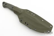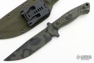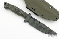 This Classic Combat by Jason Stout features a green/black coated blade and tang with thumbrest and fullers, false top edge, .187" blade stock and 1.57" blade depth, full tang construction. The handle has camo g10 scales with lanyard hole. Comes with a kydex sheath with TekLok. New from maker at the Atlanta Blade Show!