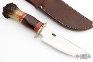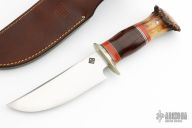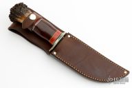 This Fighter by Rocco Handmade features a satin finished blade with .167" blade stock and 1.54" blade depth, hidden tang construction. The handle features a nickel silver guard, black/red/stacked leather/aluminum spacer pattern, and a crown stag butt with stainless pin. Great look and feel. Comes with brown leather sheath. Excellent condition.