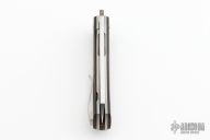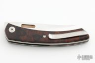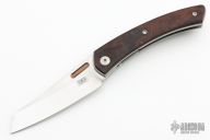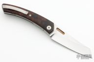This Kroko folder by Emmanuel Le Brun features a sheepsfoot style blade with mirror polished flats, satin finished flats and a notched thumbrest. The handle features desert ironwood scales over orange peeled titanium liners with a matching tip up pocket clip.  Hidden Hardware.  Includes the original box and papers.  Excellent Condition.
