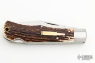 This Remington 1306 Lockback by Tim Robertson features a hand rub satin finished blade with a nail nick and notched thumbrest. The handle features stainless steel bolsters and liners, stag covers, three-piece escutcheon (SS/Copper/Brass), stainless steel backspace, brass lanyard hole. This knife is numbered 1. Includes a padded zippered case. New from Maker at the 2023 Blade Show.