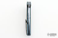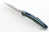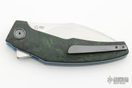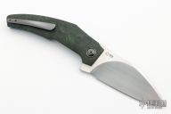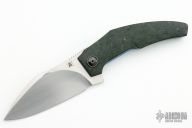 This Tashi Bharucha designed flipper by Andre Thorburn and Andre van Heerden features a hand rub satin finished blade with a false top edge, notched thumbrest and flipper. The handle is comprised of Jungle Fat Carbon scales with zirconium picot collars and pivot, anodized titanium liners, carbon fiber backspacer, tip up zirconium clip. Includes a velcro case. Nice detent, lock up and blade seating. New from maker at the 2023 Blade Show.