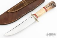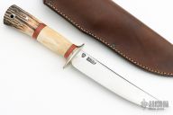 This Fighter by Rocco Handmade features a satin finished upswept convex ground blade with false top edge, .149" blade stock and 1.23" blade depth, hidden tang construction. The handle features a nickel silver guard, red/black/brass spacer pattern, bone, and pinned red stag handle with lanyard hole. Great look and feel. Comes with full stitch brown leather sheath. Has some light scuffs on the blade otherwise excellent condition.