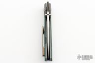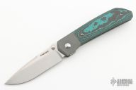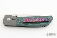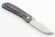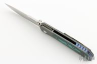 This Mula Front Flipper by Enrique Pena features a satin finished drop point blade with swedge, notched thumbrest and front flipper. The handle has bead blasted titanium bolsters with fat carbon scales and a tip up mokuti clip and an anodized titanium backspacer. Nice detent, lockup and blade seating. Comes with zippered case. New from maker!