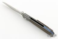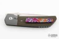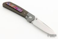 This Mula Front Flipper by Enrique Pena features a satin finished drop point blade with swedge, notched thumbrest and front flipper. The handle has bead blasted titanium bolsters with micarta scales and a tip up mokuti clip and an anodized titanium backspacer. Nice detent, lockup and blade seating. Comes with zippered case. New from maker!