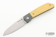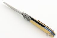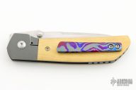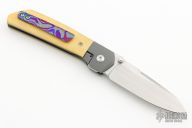 This Mula Front Flipper by Enrique Pena features a satin finished drop point blade with swedge, notched thumbrest and front flipper. The handle has bead blasted titanium bolsters with micarta scales and a tip up mokuti clip and an anodized titanium backspacer. Nice detent, lockup and blade seating. Comes with zippered case. New from maker!