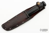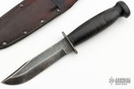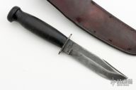 This USN Knife from Camillus Knives has a blackened clip point blade with false top edge, .159" blade stock and 1.086" blade depth, hidden tang construction. The handle has a steel guard, stacked leather grip and black butt. Coems with original brown leather sheath. Has some scratches and patina, otherwise good condition for its age.