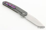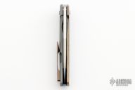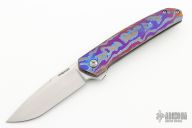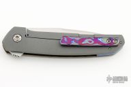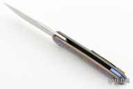This cobra Flipper by Enrique Pena features a satin finished drop point blade with swedge, notched thumbrest and front flipper. The handle has a zircuti and bead blasted titanium frame with a mokuti tip up clip. Floating anodized Titanium backspacer.  Includes padded and zippered case. New from maker!
