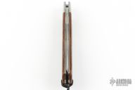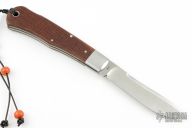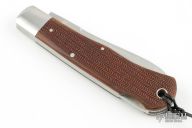 This F1 Lockback by Tom Ploppert features a satin finished drop point blade with nail nick and false top edge. The handle has stainless steel bolsters with integral liners, vintage German Saw Tooth micarta scales with rifle cartridge escutcheon on the "A" side. Stainless steel lockback. Lanyard tube and leather lanyard with beads in pommel.  Includes a padded zippered case and hand written COA. New from maker at the 2023 Blade Show.