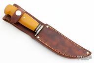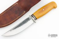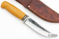 This Hunter by Rocco Handmade features a satin finished hollow ground blade with hammer marked flats, .184" blade stock and 1.11" blade depth, hidden tang construction. The handle features a nickel silver guard and butt, black/copper/aluminum spacers, and a yellow linen micarta grip with stainless pin. Great look and feel. Comes with a Treeman brown leather sheath. New from maker.