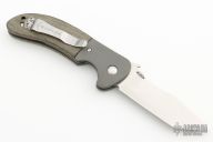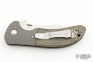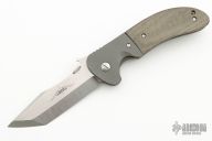 This Custom Mutant by Ernie Emerson features a satin finished tanto chisel ground blade with thumbdisc, notched thumbrest and wave feature. The handle has dovetailed and bead blasted titanium bolsters, green canvas micarta scales over titanium liners and barrel spacers, stainless steel tip up pocket clip. Has a couple light scuffs, otherwise excellent condition.