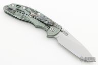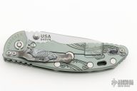 This XM-18 Slicer by Rick Hinderer Knives is a collab with Steel Flame, it features a 3.5" matte finished blade, notched thumbrest and dual thumbstuds. The handle has a custom Koi engraved titanium frame that is anodized in Seafoam Green. Custom Steel Flame Koi clip can be mounted for tip up or down carry, has Koi filler tab as well. Nice lockup, seating, and detent. Comes with original box, papers, and extra hardware. New from maker at the 2023 Blade Show. Inside of the frame is engraved with Hinderer and Steel Flames collab logo.