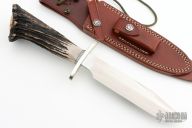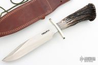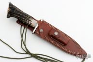 This Model 14 CDT by Randall Made Knives features a clip point satin finished blade with a sharpened top edge, .232" blade stock and 1.368" blade depth, hidden tang construction. The handle has a forward curved nickel silver guard, crown stag grip with black/duralumin spacers. Cut Down hidden tang. This knife was designed to meet the demand for an almost indestructible all-purpose knife, though it is especially suited for combat and survival purposes. Comes with a brown leather sheath and original paper wrapping. New from maker at the 2023 Blade Show.