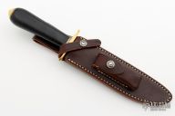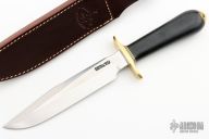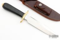 This Model 1-7 from Randall Made Knives features a satin finished clip point blade with sharpened top edge, .210" blade stock and 1.270" blade depth, hidden tang construction. The handle is comprised of a brass guard and coolie cap butt, black/brass spacers, and a black linen micarta grip. Comes with brown leather sheath. New from maker at the 2023 Blade Show.