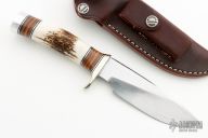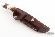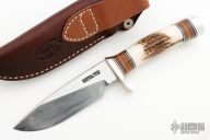 The Model 25-5 by Randall Made Knives is a drop point hunter similar to Model 11, but handle construction is reminiscent of 1930′s design. Excellent skinning, outdoors knife. This knife has a carbon steel blade with notched thumbrest, .203" blade stock and 1.337" blade depth, hidden tang construction. The handle nickel silver guard and duralumin pommel, stag grip with stacked leather, black and duralumin spacers. Comes with brown leather sheath and original paper wrapping. New from maker at the 2023 Blade Show.