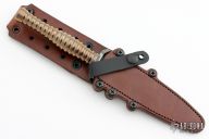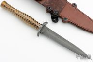 This Custom Rook 6 Dagger has a hand ground Damascus blade with .169" blade stock and .904" blade depth, hidden tang construction. The handle has a Damascus guard and gold titanium handle. Comes with a brown leather sheath by Chattanooga Leatherworks. Comes with original box. New from maker at the 2023 Blade Show.