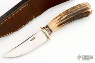 This Caper by Jim Behring "Treeman" features a convex ground satin finished blade with .102" blade stock and .946" blade depth, hidden tang construction. The handle has a brass guard with a sambar stag grip, black/red/brass spacer pattern. Comes with a brown leather sheath. New from maker at the 2023 Blade Show.