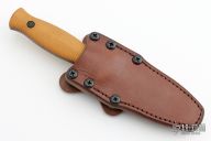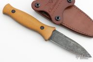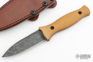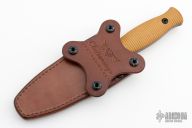 This MK3 Boot Knife by Les George features an acid tumble finished blade with false top edge, .199" blade stock and 1.041" blade depth, full tang construction. The handle has buterscotch paper micarta scales. Comes with a brown leather sheath by Chattanooga Leatherworks. Comes in a nylon zippered case. New from maker at the 2023 Blade Show.