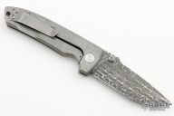This Project VECP by Les George features a Damascus blade and a stonewashed titanium frame with matching tip up clip. Hinderer lock bar stabilizer. Phosphorus bronze washers. Smooth action. Nice blade seating, detent and lockup. Comes with a zippered case. New from maker at the 2023 Blade Show.