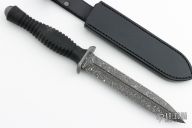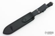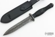 This FS Dagger by Les George and Allen Elishewitz features a black snow finished double edged blade with fullers, .175" blade stock and .993" blade depth, hidden tang construction. The handle has a blasted titanium guard, carbon fiber grip and titanium butt with lanyard hole. Comes with a black leather sheath by SoulBound leather and a zippered case. New from maker at the 2023 Blade Show.