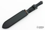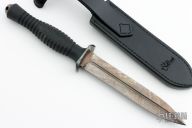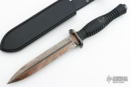 This FS Dagger by Les George and Allen Elishewitz features a double edged blade with fullers, .175" blade stock and .995" blade depth, hidden tang construction. The handle has an anodized titanium guard, carbon fiber grip and titanium butt with lanyard hole. Comes with a black leather sheath by SoulBound leather and a zippered case. New from maker at the 2023 Blade Show.