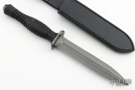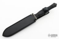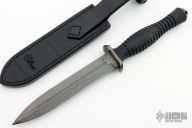 This FS Dagger by Les George and Allen Elishewitz features a double edged Damascus blade with fullers, .169" blade stock and .990" blade depth, hidden tang construction. The handle has an anodized titanium guard, carbon fiber grip and titanium butt with lanyard hole. Comes with a black leather sheath by SoulBound leather and a zippered case. New from maker at the 2023 Blade Show.
