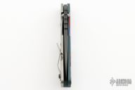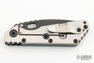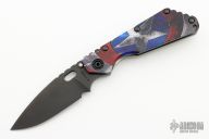 This SMF from Strider Knives features a black blade with notched thumbrest and thumbhole. The handle has a green G-10 and orange peel finished titanium handle and tip up clip. Notches on thumbrest, rear of handle, and lockup. Includes Hinderer "Lock Bar Stabilizer" for maximum reverse lock retention. Has "Captain America" theme on the handle. Nice action, detent and blade seating. One of 10. New condition.