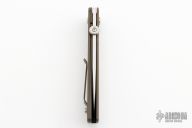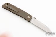 This Model 1 linerlock folder features a stonewashed wharncliffe blade with thumbdisc. The handle has a bead blasted and anodized titanium frame and liner, black backspacer, titanium tip up clip. Nice detent, lockup and blade seating. Excellent condition. Comes with a zippered case.