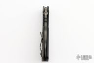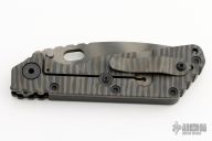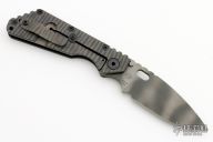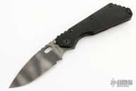 This SMF from Strider Knives features a tiger stripe blade and textured black G-10 and flamed titanium handle and matching tip up titanium clip. Notches on thumbrest, rear of handle, and lockup. Includes Hinderer "Lock Bar Stabilizer" for maximum reverse lock retention. Has a few light scuffs and some light oxidation, otherwise excellent condition. Comes with a zippered case.