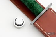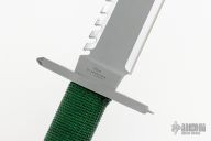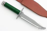 This Lile Cerakote Minature First Blood Knife by Vaughn Neeley, it features a two tone blade with Titanium Grey Cerakote center and satin finished grinds, sharpened top edge and 14 saw-teeth on blade spine, .182" blade stock and 1.189" blade depth, hidden tang construction. The handle has a Titanium Grey Cerakote stainless steel double guard with flat and Phillips head screwdrivers, hollow cord wrapped handle, and aluminum removable butt cap with an O-ring to make it water-proof. Comes with brown leather sheath that has a honing stone in the sheath. Has compass in butt cap.  Comes with zippered case. New From Maker!