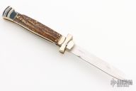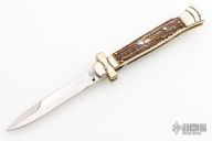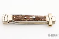 This lockback Auto by AGA Campolin has a mirror polished stainless steel spear point blade with false top edge. Handle is stag with mirror polished nickel silver bolsters, brass liners, stainless steel backspacer. Excellent condition.