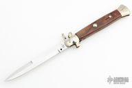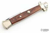 This is Ring Pull Auto by AGA Campolin with a mirror polished spear point blade with false top edge. Number 13 of just 30. Nickel silver bolsters and butt with cocobolo scales, brass liners, stainless steel backspacer. Nice action. Has a few light scratches, otherwise excellent condition.