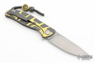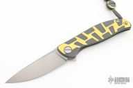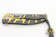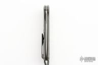 This F95T by Shirogorov Knives features a stonewashed blade with a notched thumbrest and flipper. The handle has a two-tone milled titanium frame with matching titanium backspacer and tip up clip. Nice detent, lockup and blade seating. Has MRBS. Comes with original box and COA. Light scratches are visible on the frame otherwise the knife is in Excellent condition.