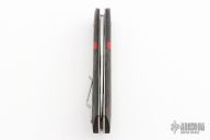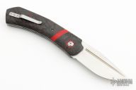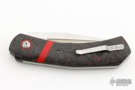 This auto by Philip Booth features a hand rub satin finished blade with fullers and false top edge. The handle has red/black Fat Carbon scales with red G-10 pivot collars and bands, stainless steel liners and backspacer, tip up stainless steel clip. Comes with zippered case and COA. New from maker at the 2023 Blade Show.