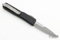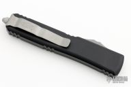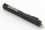 This knife from Microtech was the 2023 Blade Show Special. It has a double edged bayonet ground blade with an Apocalyptic finish. The handle is black frag pattern G-10 and black aluminum with a tip down Apocalyptic stainless clip and glass breaker at the butt. Comes with original box and papers. New from maker at the 2023 Blade Show.