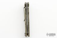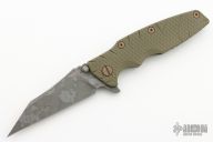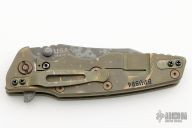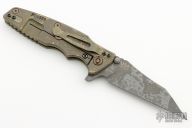 This Eklipse Flipper by Rick Hinderer Knives features a 3.5" distressed finished blade, notched thumbrest and flipper, dual thumbstuds. The handle has a green G-10 scale, and distressed bronze anodized titanium handle/clip. Clip can be mounted for tip up or down carry. Nice lockup, seating, and detent. Comes with original box and extra hardware. New from maker!