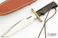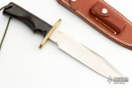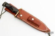 The Model 14-7.5 by Randall Made Knives features satin finished blade with sharpened top edge, .219" blade stock and 1.378" blade depth, full tang construction. The handle has a double brass guard, and black linen micarta grip with a lanyard hole. Comes with a brown leather sheath and original paper wrapping. Excellent condition.