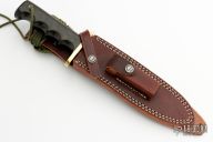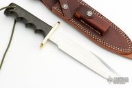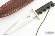 This Model 14 by Randall Made Knives features a satin finished blade with sharpened top edge, .207" blade stock. 1.323" blade depth, full tang construction. The handle has a brass guard, black linen micarta handle with a lanyard hole at the butt. This knife was designed to meet the demand for an almost indestructible all-purpose knife, though it is especially suited for combat and survival purposes. Comes with brown leather sheath and original paper wrapping. New from maker at the 2023 Blade Show.