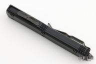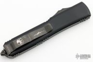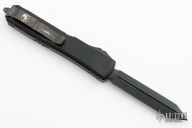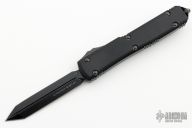 This knife by Microtech is a Spartan Ultratech, it has a black coated double tanto blade with fullers and double edged. The handle is black aluminum with contoured grip, black thumb slide, clip, hardware and glass breaker. Comes with original box and papers. Dated 03/2021 with a S/N of 845. Has some light scratches on the clip, and a small ding in the frame. Great condition otherwise.