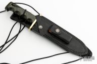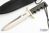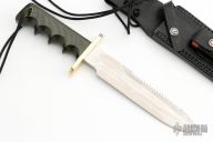 The Model 14-7.5 by Randall Made Knives features satin finished blade with sawteeth, .231" blade stock and 1.394" blade depth, full tang construction. The handle has a double brass guard, and black linen micarta grip with a lanyard hole. Comes with black leather sheath and original papers wrapping. New from maker at the 2023 Blade Show.