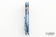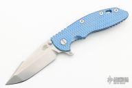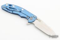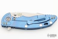 This XM-18 Skinny by Rick Hinderer features a stonewash finished blade with notched thumbrest and flipper. The handle has a blue stonewashed titanium frame, and a tip up or down reversible titanium clip and filler tab, lanyard hole at the butt. Comes with original box, blue g10 scale, liner, and extra hardware. Excellent condition.
